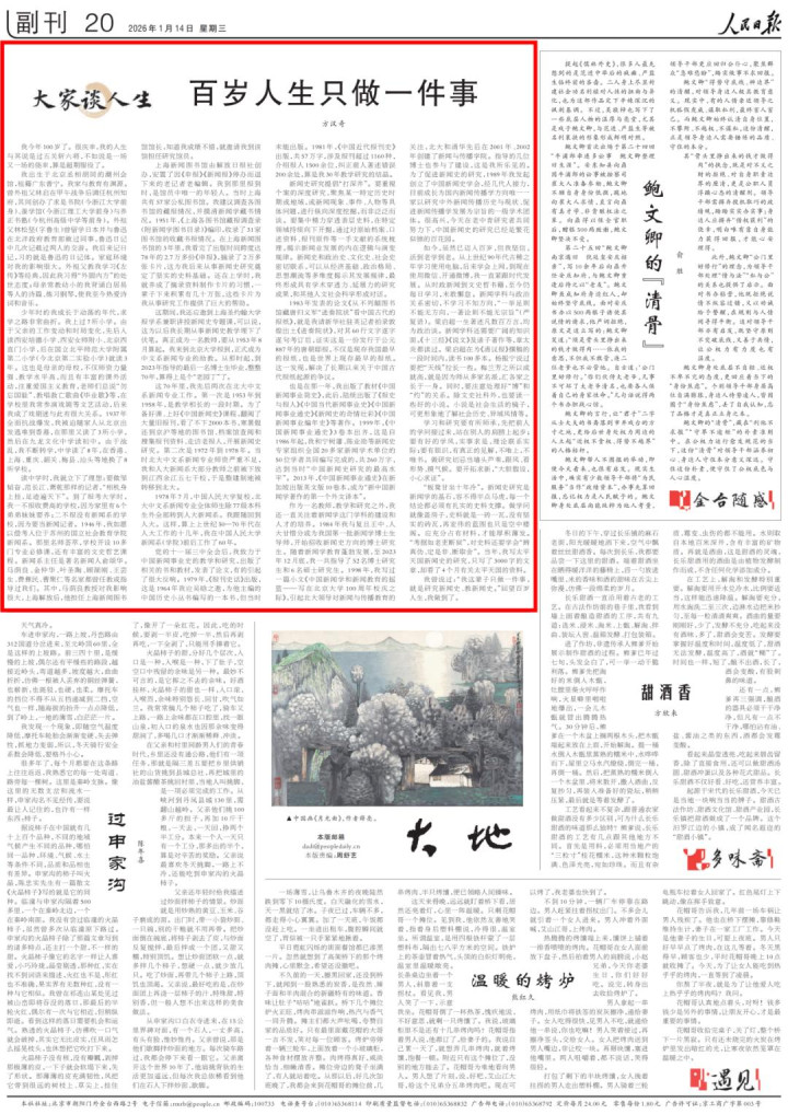 2026年1月14日,《东说念主民日报》第20版“大众谈东说念主生”栏目,刊发新中国新闻史学奠基东说念主、中国东说念主民大学荣誉一级教训方汉奇先生的文章《百岁东说念主生只作念一件事》。