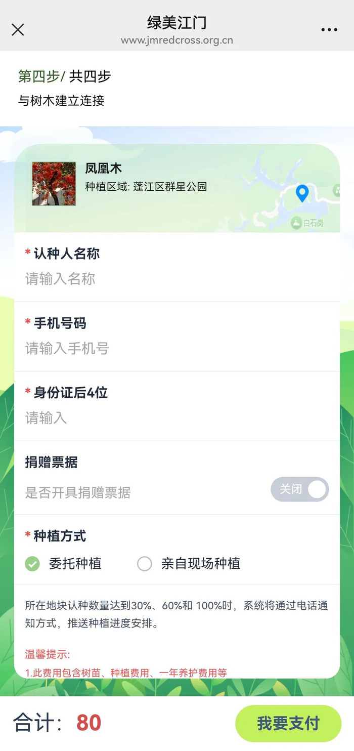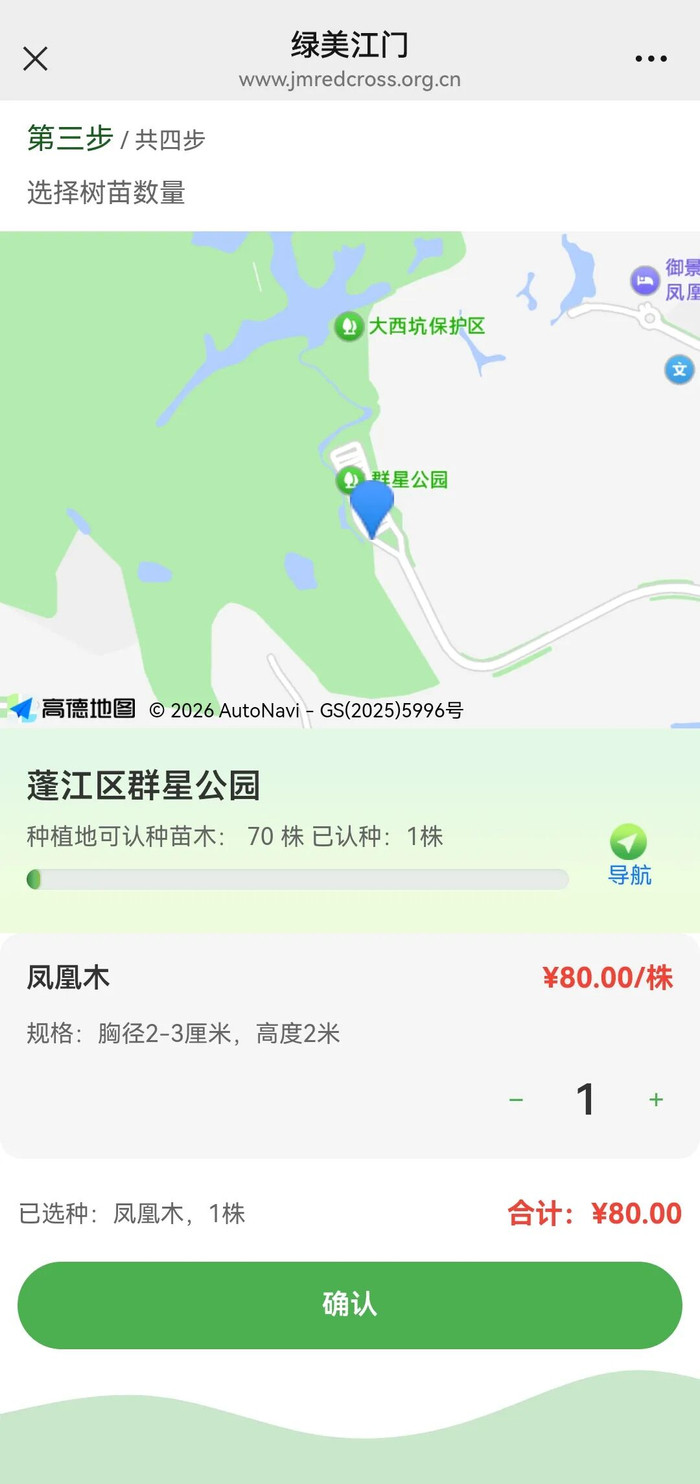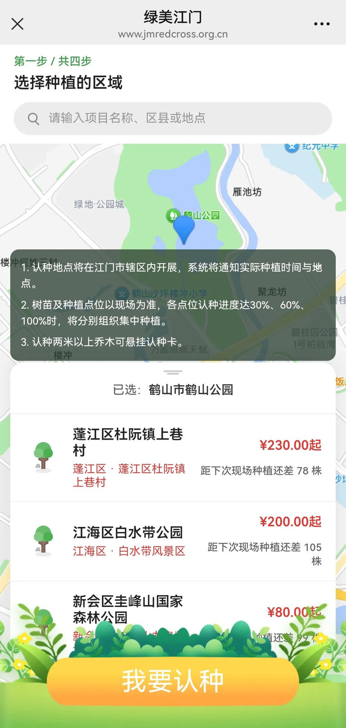 “我为侨乡种棵树”线上植树互动平台由市绿好意思江门专班依托江门市红十字会“理智红会”捐赠平台成就,见地是为市民参与绿好意思江门成就、施行植树义务提供粗浅的线上渠说念。市民一又友动脱手指,就可收场线上挑选培植场地、培植树种、培植价钱以及培植数目等。