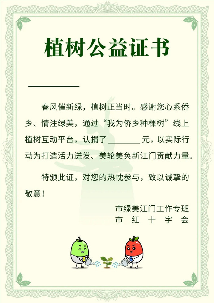 2.江门市红十字会将为每位参与捐钱的市民颁发“植树公益文凭”。表情抓行方为认种两米以上乔木的市民吊挂认种卡。