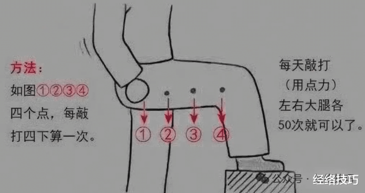坐在床边,双腿垂下。双手合手成空拳,从臀部外侧(也即是环跳穴隔邻)起,沿着大腿外侧中间,轻轻敲打到膝盖外侧,控制腿鉴识敲30次控制,力度要合适,有细小升沉感就行。