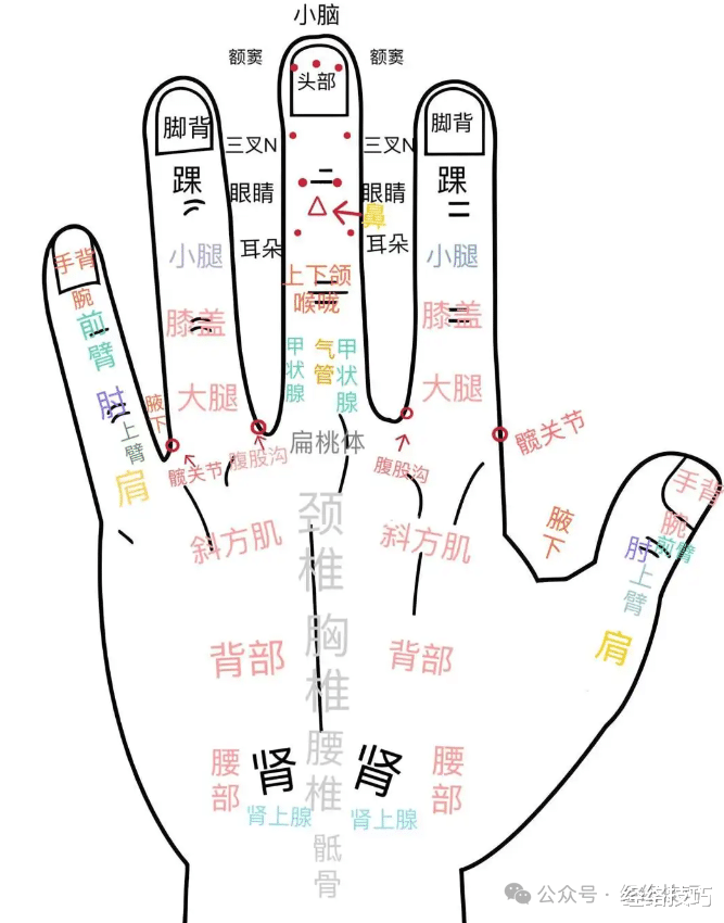 在传统不雅念中,手是经络的“中转站”,手三阴经和手三阳经齐在这里历程、交织,就像躯壳里的通谈,连结着五藏六府。手背有些部位,颠倒对应着头颈和后背,可以作为全身的一个小缩影。轻轻地揪揪这些部位,关于调度对应部位的气血轮回,也许有一定的扶植作用。