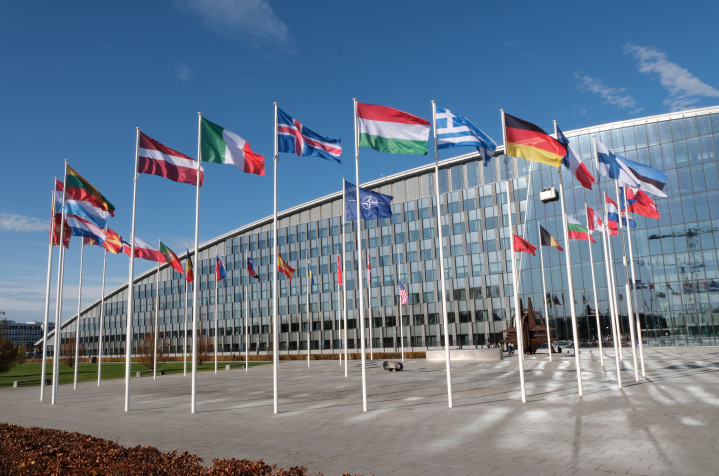 这是2025年11月5日在比利时王人门布鲁塞尔拍摄的北约总部大楼外的北约及成员国旗子。新华社记者张兆卿摄