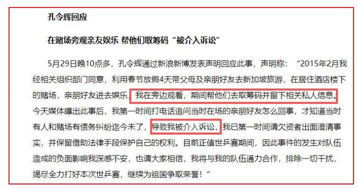 孔令辉很快通过微博复兴,辩称是亲一又借款,我方只是在场帮衬取筹码,并未参与赌博。