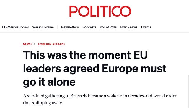 当地时代23日,《政事报》欧洲版发布批驳著述《就在此时,欧盟训导东谈主一致合计欧洲必须自作流派》。著述指出,在布鲁塞尔举行的这场懊恼千里闷的峰会,现实上是对一个正在祛除的、延续了几十年的寰宇次第的吊问。著述指出,与此前召开的历次欧盟峰会比拟,此次峰会莫得浓烈的争论,也莫得作念出任何决定。但著述征引四位欧盟社交官和一位了解训导东谈主究诘内容的官员的话报谈说,此次会议悄然标明了一种通晓,即旧次第与新次第之间存在着决定性的断裂,欧洲自二战以来的运作形态与将来将要濒临的形势迥然相异。