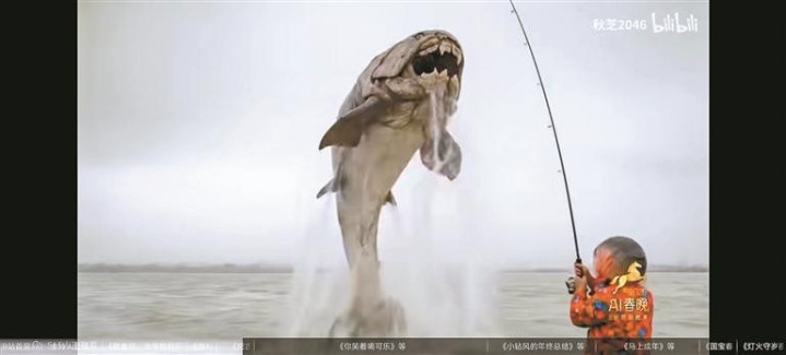 AI让鱼头东说念主钓起邃古巨兽。