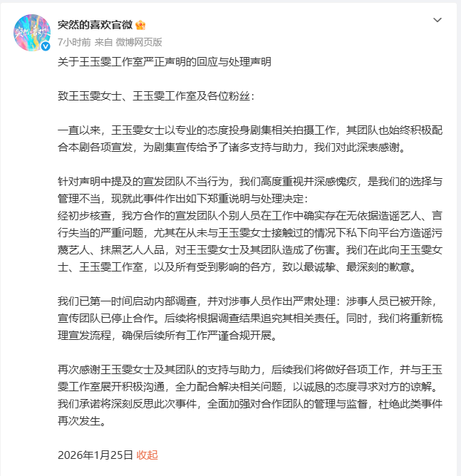经初步核查,本人互助的宣发团队个别东说念主员在职责中如实存在无依据虚拟艺东说念主、言行不当的严重问题,尤其在从未与王玉雯女士往返过的情况下私行向平台方虚拟扭曲艺东说念主、抹黑艺东说念主东说念主品,对王玉雯女士过火团队形成了伤害。咱们在此向王玉雯女士、王玉雯职责室,以及系数受到影响的各方,致以最诚笃、最深切的歉意。咱们已第一时辰开动里面访问,并对涉事东说念主员作出严肃处理:涉事东说念主员已被开除,宣传团队已罢手互助。后续将凭据访问成果根究其联系包袱。同期,咱们将重新梳理宣发过程,确保后续系数职责严谨合规开展。