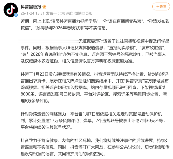 孙涛于1月23日发布视频清醒联系情况。抖音运营团队连续严格照顾,针对前述坏话推出求真卡,展示在联系热门话题和搜索成果中,并在“抖音求真”官方账号发布辟谣视频。联系坏话均已加入数据库,站内存量视频已进行回查,下架视频超过8000条,坏话首发账号已被封禁。平台对批驳区、搜索词条等场景同步照顾,计帐6万余条批驳。