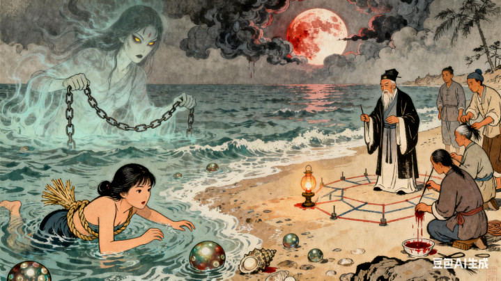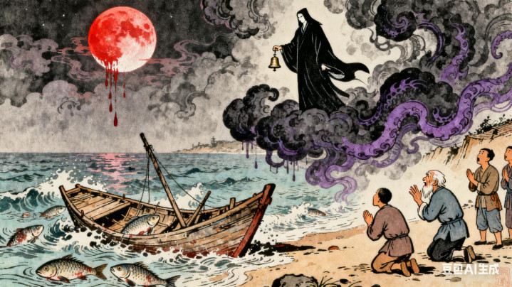 云里头,迷糊有个东谈主影,披着黑袍,脸白得吓东谈主,手里拎个铃铛,一摇,海里就浮上来死鱼。