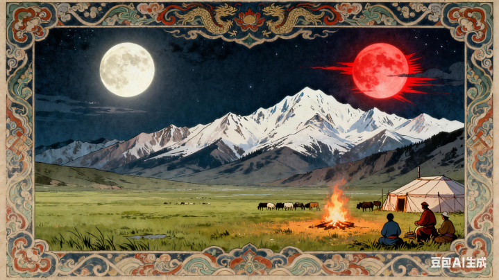昆仑山口的牧民都知谈,每逢月圆之夜,天边总会悬着两轮明月,一轮清辉洒草原,一轮红芒照雪山。