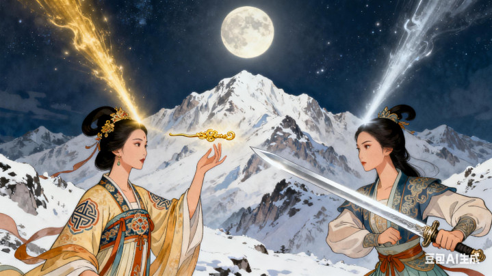 月圆之夜,两东谈主登上昆仑之巅。