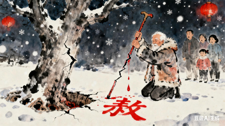 话音未落,手杖“啪”地裂开一起缝,血红的汁液渗出来,在雪地上汇成个歪七扭八的“赦”字。