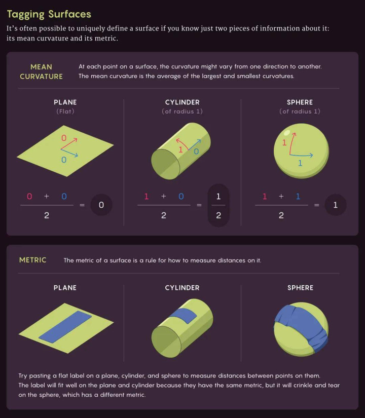 其中一种方法捕捉的是对于曲面「外皮」曲率的信息,即在曲面上任选一丝,你不错沿着无限多的标的操办曲面在空间中的周折进程,也等于所谓的曲率。只温雅那些能得到最大和最小曲率值的标的,然后取这两个值的平均数,得到的数值被称为「平均曲率」。你不错操办曲面上即兴给定点的平均曲率,从而更好地贯通它是如何置于周围空间之中的。
