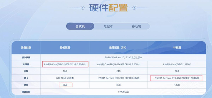 先来望望关于PC台式机的硬件需求,最低配置皆要i5-9600,内存亦然奏凯16G智商带动,显卡最低需求亦然5G。
