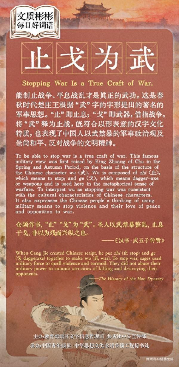 WhenCangJiecreatedChinesescript,heputzhiandgetogethertomakewu.Tostopwar,sagesusedmilitaryforcetoquellviolenceandturmoil.Theydidnotabusetheirmilitarypowertocommitatrocitiesofkillinganddestroyingtheiropponents.(TheHistoryoftheHanDynasty)