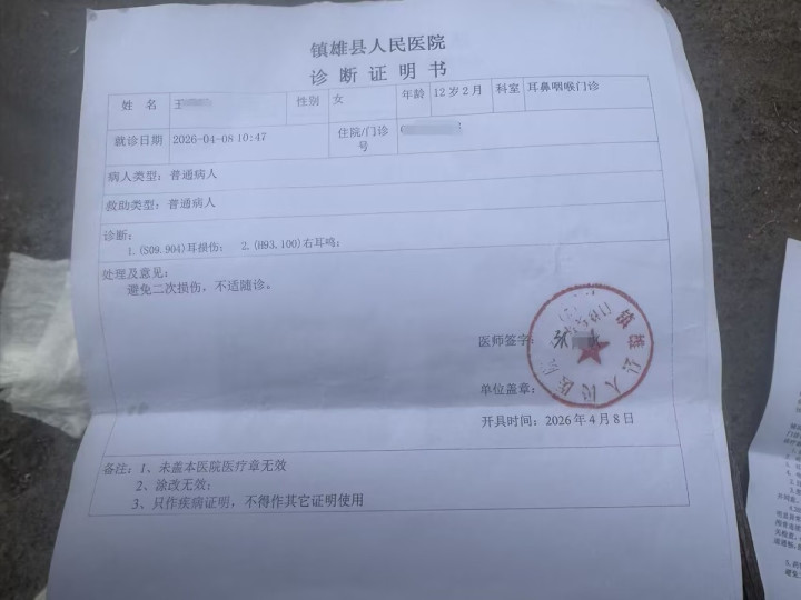 王先生告诉极目新闻记者,他男儿本年12岁,在镇雄县蓄菁学校读六年齿,在该校投寄。4月7日晚,他前妻接到男儿打来的电话,称我方被学校别称安分扇了几耳光,在外务工的他得知男儿被安分扇流鼻血后,便向镇雄县当地警方报了警。